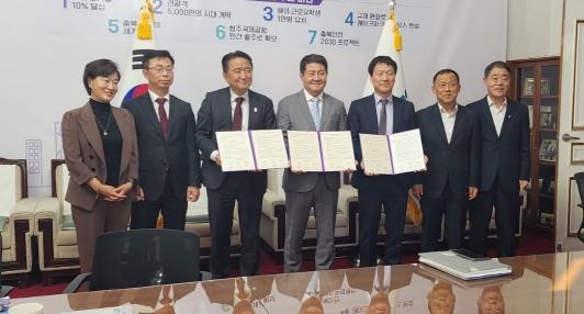 협약식에는 청주시 전용운 경제교통국장, 김영환 충북도지사, 이치완 ㈜영신쿼츠 대표이사 등이 참석했다.