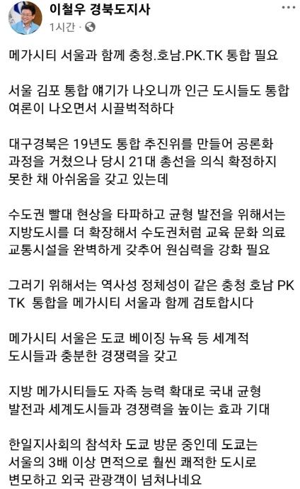 최근 서울 김포 편입 추진 방안이 대두되며 인근 도시들까지도 통합 여론이 불거져 나오는 가운데, 이철우 도지사는 메가시티 서울과 함께 충청, 호남, PK, TK도 통합이 필요하다는 입장을 3일 밝혔다.