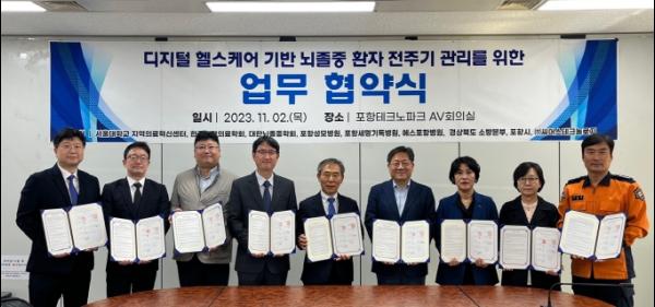 포항시는 지난 2일 포항테크노파크에서 ‘디지털 헬스케어 기반 뇌졸중 환자 전주기적 관리 체계 구축 실증’ 추진과 관련해 총 9개의 주요 학회, 지역 종합병원, 헬스케어 기업, 행정·지원기관 간 업무협약을 체결했다고 밝혔다.