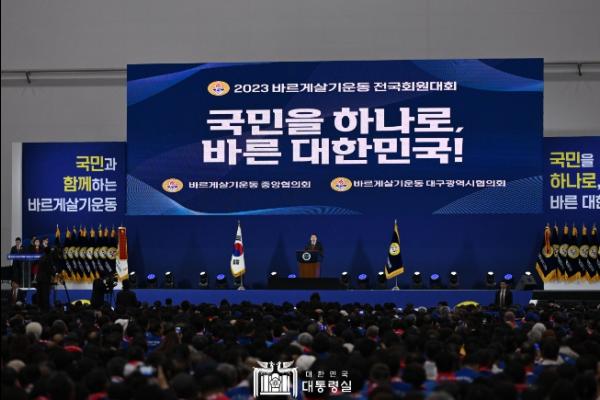 윤석열 대통령은 11월 7일 오전 대구 EXCO에서 열린 ?2023년 바르게살기운동 전국회원대회?에 참석해 바르게살기운동 전국 회원들을 격려했다. 1989년 설립된 바르게살기운동 행사에 현직 대통령이 참석한 것은 1999년 김대중 前 대통령 이후 두 번째이다.