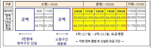 현재 4만원대 중후반인 이통3사의 최저구간 5G 요금을 3만원대로 하향하고, 30GB 이하 소량 구간 5G 요금제의 데이터 제공량을 세분화 한다.
