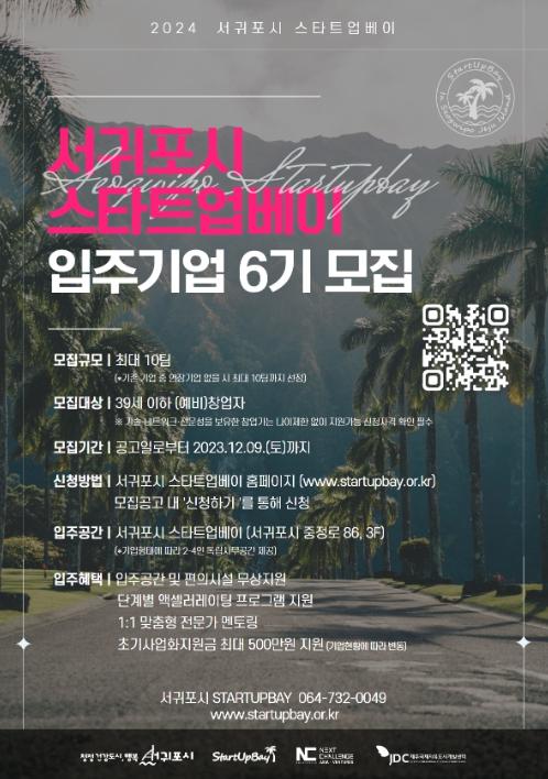 서귀포시는 오는 12월 9일까지 2024년 서귀포시 스타트업베이에 입주할 청년 기업을 최대 10팀까지 모집한다.