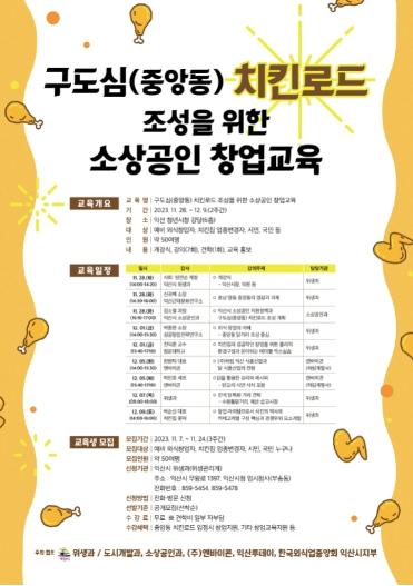 익산시가 ‘구도심(중앙동) 치킨로드’를 이끌 소상공인 창업 교육을 오는 28일부터 12월 9일까지 2주간 실시한다.