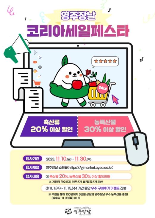 행사 기간 쇼핑몰에서는 사과, 인삼, 한우 등 약 3000여 개의 영주시 우수 상품을 농특산품 최소 30%, 축산품 최소 20% 이상 할인 판매한다. 이번 행사는 영주장날 쇼핑몰에 큰 성원을 보내준 고객들에게 보답하고자 개최되는 올해 마지막 할인행사로 예산소진 시까지 진행된다.