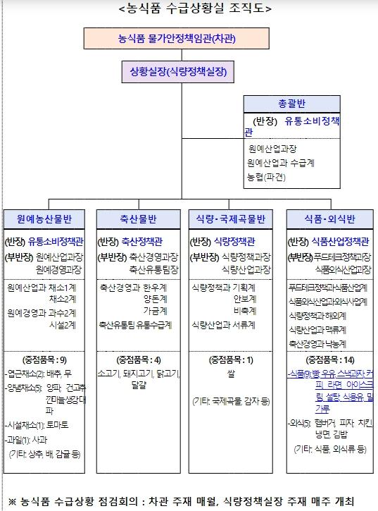 이번 회의는 지난 11월 2일 경제부총리 주재로 열린 ‘비상경제장관회의 겸 물가관계장관회의’에서 각 부처 차관이 물가안정책임관이 되어 소관 품목의 물가 안정을 책임지고 현장 중심의 물가 대응체계를 가동하겠다는 발표에 대한 후속 조치로서, ‘농식품 수급상황실’을 차관 직속으로 격상하여 농식품 물가를 보다 엄중하게 관리하기로 한 것이다.
