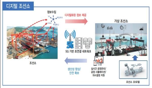 수십만~수백만개의 사물인터넷(IoT) 기기 접속이 요구되는 조선소의 환경에서 각각의 통신망을 5지(G) 연결망(네트워크) 기술로 통합해 ▲디지털 조선소 통신 기반 구축 ▲ 디지털 조선소 지능화 기반 구축 ▲융합서비스 기술개발 ▲데이터 기반 및 소프트웨어 품질관리 등의 기술개발을 수행하는 사업이다.