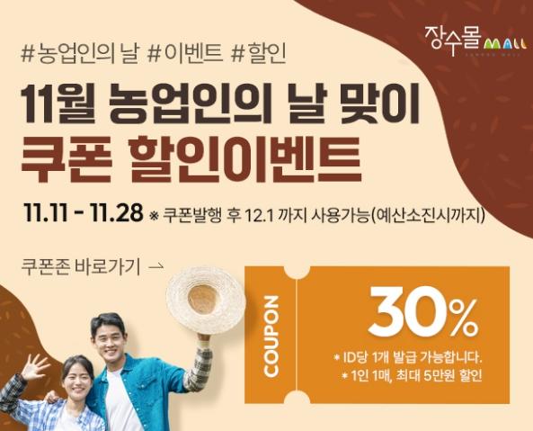 장수군이 장수군 직영 온라인 쇼핑몰인 장수몰에서 농업인의 날을 기념해 오는 11월 11일부터 한 달간 전 품목 30% 할인 행사를 진행한다.
