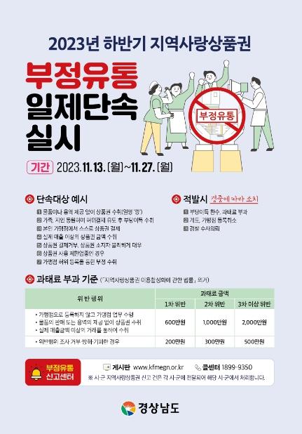 부정유통 행위가 적발될 경우 '지역사랑상품권 이용 활성화에 관한 법률'에 따라 가맹점 등록 취소, 부당이득 환수 또는 최대 2,000만 원 이하의 과태료가 부과된다.