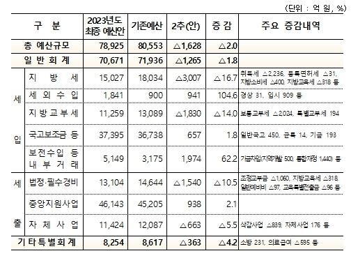 특히, 국내 경기 침체의 장기화로 내년도 세수가 밝지 않을 것으로 전망됨에 따라, ‘23년도 지방세 전망액(15,027억)을 감안해 ‘24년도 지방세는 전년도 대비 2,092억 원을 줄여 편성하는 등 여건을 반영해 세입 추계를 한 것으로 알려졌다.