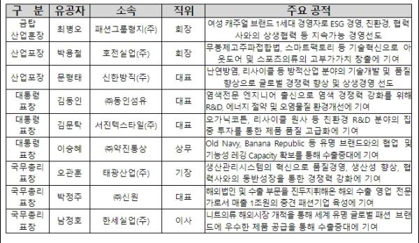 산업포장은 우수한 봉제 기술력 및 제품의 품질 경쟁력을 토대로 매출액의 약 95% 이상을 수출하고 있는 호전실업(주) 박용철 회장과 국내 원료회사와의 상생 협력 및 적극적인 기술개발 투자를 통해 그간 수입에만 의존해오던 원료를 국산화하여 불에 잘 타지 않는 방염 원사를 생산 및 판매하고 있는 신한방직(주) 문형태 대표가 수상했다.