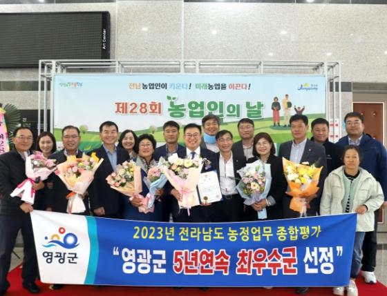 영광군은 11월 10일 장성군 문화예술회관에서 열린 제28회 농업인의 날 기념행사에서 전남 최초 5년 연속 전라남도 농정업무평가 “최우수상”을 수상했다고 밝혔다.