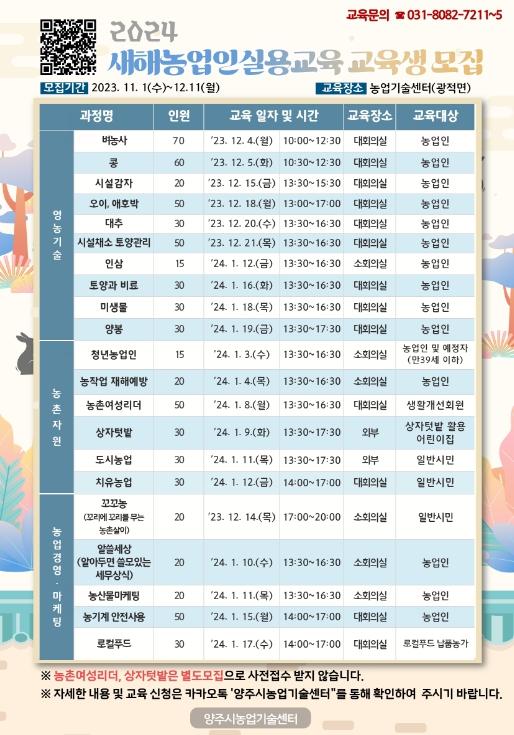 관내 주민등록을 둔 양주시민이라면 누구나 접수할 수 있으며 신청 방법은 ▲구글폼 접속 후 설문 제출, ▲카카오톡에서 ‘양주시농업기술센터’ 검색 후 ‘2024년 새해농업인실용교육’ 게시글의 링크를 눌러 설문 제출, ▲ 홍보물에 있는 QR코드 접속 후 설문 제출 등 3가지 방법 중 한 가지 방법을 선택해 설문을 제출하면 된다.