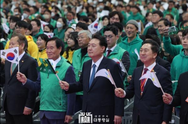 윤석열 대통령은 11월 12일 오후 경기도 일산 킨텍스에서 열린 ?2023전국새마을지도자대회 ‘청년의 약속’ 선포식?에 참석해 새마을지도자와 청년새마을 회원들을 격려했다.