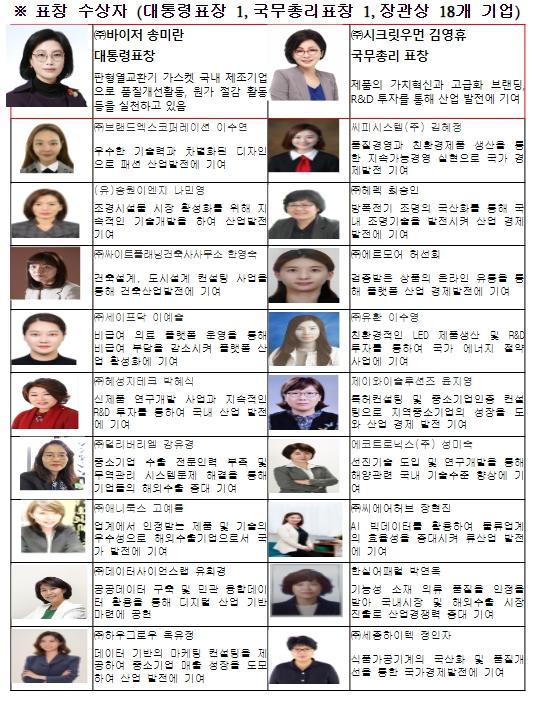 특별히 올해 최초로 대통령 표창이 신설됐으며, ‘열교환기 및 자동차 배터리 가스켓’을 생산?수출하는 ‘㈜바이저 송미란 대표’에게 수여됐다.