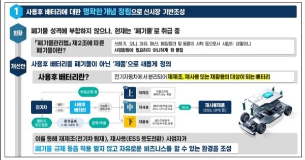 우선 업계(안)은 사용후 배터리를 ‘폐기물’이 아닌, ‘전기차에서 분리되어 재제조·재사용·재활용 대상이 되는 배터리’로 새롭게 정의하고 있다. 사용후 배터리는 셀 일부를 수리·교체한 후 자동차에 탑재하거나(재제조), 에너지 저장장치 등으로 용도 전환이 가능해(재사용) 충분한 경제적 가치를 갖고 있음에도 현재는 폐기물법상 폐기물로 분류돼 관련 규정을 적용받고 있다.