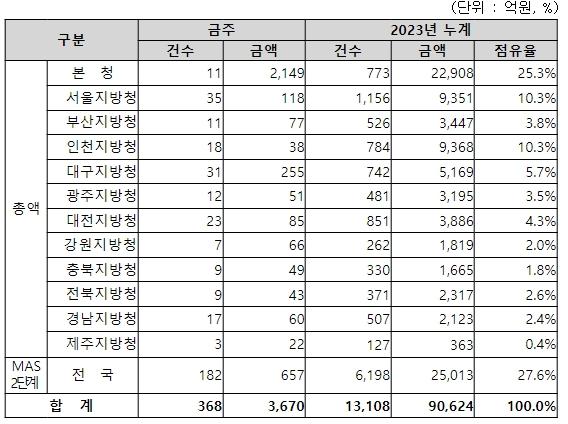 지역별 발주량을 보면, 총액계약 대상 3,013억 원 중 본청이 2,149억 원으로 71.3%를 집행하고 서울청 등 11개 지방청에서 864억 원을 각각 집행할 예정이다.