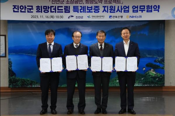 진안군은 16일 군청 상황실에서 전북신용보증재단-전북은행-NH농협은행과 함께 관내 소상공인 자금지원을 위한 특례보증 협약식을 개최했다.