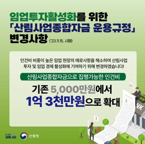김용진 사유림경영소득과장은 “이번 '산림사업종합자금 운용규정'의 개정으로 2008년 제정 이후 15년 동안 동결됐던 인건비 집행 한도를 최저임금 상승률 등을 고려하여 현실화했다”라며, “앞으로도 민간 임업투자 활성화를 위해 불합리한 규제를 개선하도록 노력하겠다”라고 말했다.