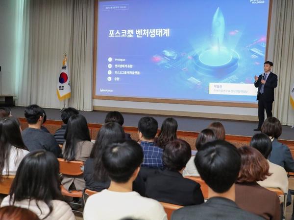 특강 강사인 ㈜포스코홀딩스 박성진 전무는 연구중심 대학인 포스텍, 포항산업과학연구원(RIST), 정부·지자체, 포스코 그룹, 벤처지구(밸리) 입주기업 간 형성된 범(汎) 포스코 벤처체제(플랫폼)를 통한 신사업 발굴, 벤처투자와 연구결과 상용화, 확대(스케일업) 육성의 사례와 성과 등을 공유했다.