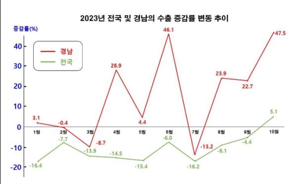 16일 발표된 한국무역협회 수출입 통계에 따르면, 10월 월간 경남 수출은 지난해 같은 달보다 47.5% 상승한 43억 2천2백만 달러, 수입은 32.1% 감소한 18억 4천6백만 달러다.