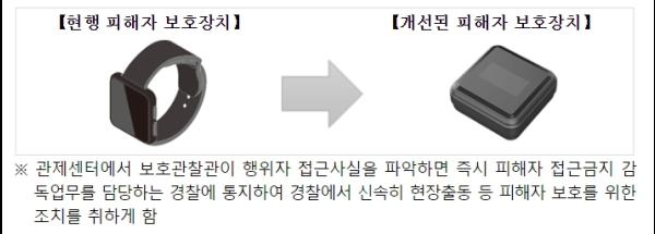 스토킹 행위자가 피해자에게 일정 거리 이내로 접근 시 피해자가 행위자의 접근 사실을 알 수 있도록 피해자의 휴대전화로 행위자의 위치정보를 자동으로 문자 전송하는 ‘스토커 위치정보 피해자 알림 시스템’ 개발을 완료했고, 손목착용식인 보호장치를 휴대가 간편하도록 개선하여 ’24년 1월 12일 법률 시행일부터 현장에 적용할 예정이다.