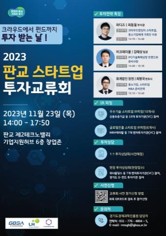 경기도와 경기도경제과학진흥원은 판교테크노밸리 내 글로벌 진출 가능성이 높은 우수 새싹기업(스타트업)을 발굴하고, 이들에게 실질적인 투자유치 기회를 제공하기 위해 오는 23일 ‘2023 판교 스타트업 투자교류회’를 연다.