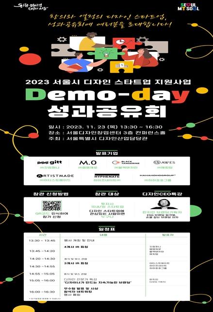 서울시는 23일 13시 30분 서울디자인창업센터 3층 컨퍼런스홀에서 참여기업, 투자자 및 관계자 등 100여명이 참석한 가운데 데모데이(시연회) 형식으로는 처음으로 ‘2023 서울시 디자인 스타트업 지원사업 성과공유회’를 개최한다고 밝혔다.