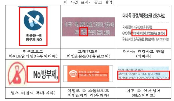 이들이 판매하는 인섹트도그 하이포알러젠(나투어리베, 데이원), 그레인프리 치킨&살몬(네츄럴코어), 더마독 건강사료 관절(더마독), 웰츠 어덜트 독 및 헤일로 독 스몰브리드 치킨&치킨간(우리와), 아투 독 연어·청어(펫스테이트) 제품은 ‘무방부제’, ‘보존제 무첨가’ 등으로 표시·광고했으나 시험결과 방부제가 함유되어 있는 것으로 나타났다.
