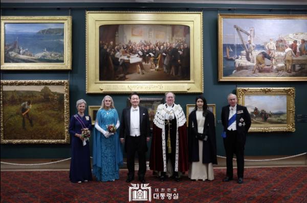 윤석열 대통령 부부는 현지시간 11월 22일 수요일 저녁 런던 길드홀에서 런던금융특구(City of London) 마이넬리 시장(Lord Mayor)이 주최한 만찬에 참석했다. 이날 만찬은 런던금융특구의 본청인 길드홀(Guild Hall)*에서 3시간 가량 진행됐습니다. 만찬에는 영국에서 활동하는 우리 경제인들과 동행하는 경제사절단이 참석했으며, 영국 측에서는 런던금융특구 시의원, 왕실 인사 및 런던의 주요 경제·금융인들이 함께 했다.