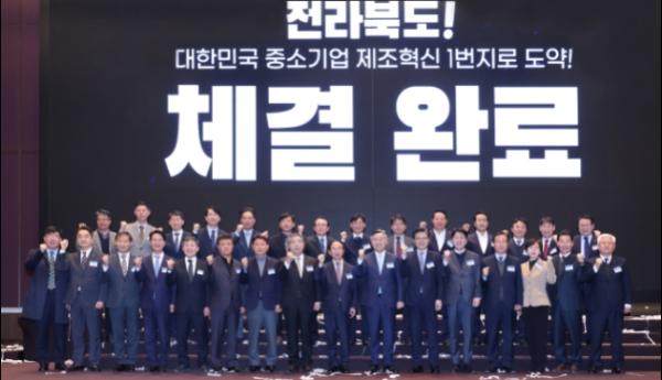 전북도는 24일 도와 14개 시·군, 삼성전자, (사)전북-삼성 스마트CEO 포럼, (재)전북테크노파크와 함께 도내 중소기업 제조현장의 디지털전환을 위한 전북형 스마트 제조혁신 프로젝트 업무협약을 체결했다고 밝혔다.