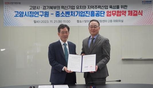 고양시정연구원과 중소벤처기업진흥공단은 11월 21일 빛마루방송지원센터 2층 대회의실에서 '고양시 및 경기북부의 혁신기업 유치와 지역주력산업 육성을 위한 업무협약(MOU)'을 체결했다.