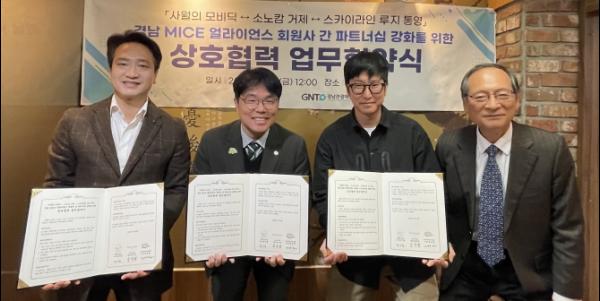 경남관광재단은 24일 도내 관광·마이스 업계 동반성장을 위해 ‘경남 마이스 얼라이언스’ 회원사인 ‘사월의 모비딕’, ‘소노캄 거제’, ‘스카이라인 루지 통영’이 업무협약을 체결했다고 밝혔다.