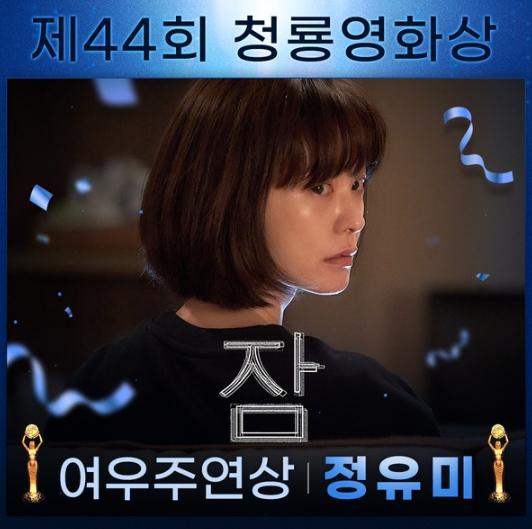 '잠'에서 매일 밤 반복되는 공포에 잠들지 못하는 아내 ‘수진’으로 열연해 호평을 이끌었던 배우 정유미는 감격한 모습으로 수상대에 올라 “너무 떨린다. 감사하다. 이 상을 주신 관계자분들, 영화 '잠'을 극장에 와서 봐주시고 응원해 주신 많은 분들께 진심으로 감사드린다”라고 소감을 전했다.