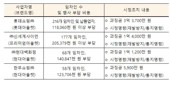 공정거래위원회는 대형 아울렛 4개사가 판매촉진 행사 실시 전에 서면 약정하지 않고 매장임차인)에게 행사 비용을 부담시킨 행위에 대해 시정명령 및 과징금(6억 4,800만 원) 부과를 결정했다.
