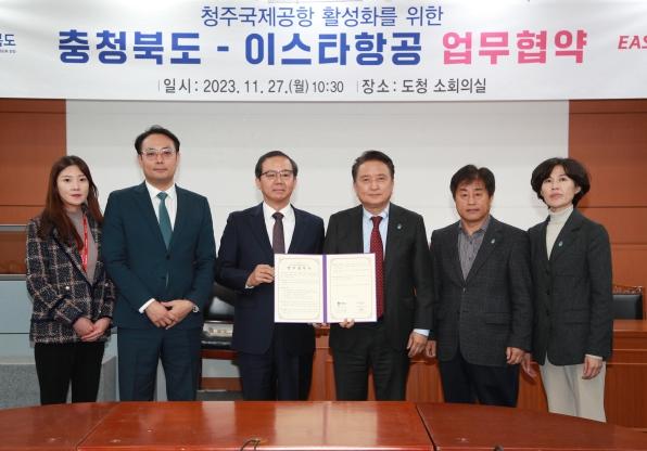 김영환 충북도지사는 11월 27일 충북도청에서 이스타항공 조중석 대표와 청주국제공항 활성화를 위한 업무협약을 체결했다.