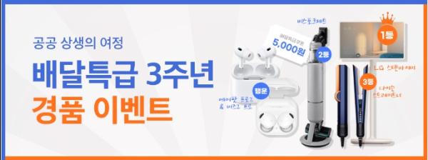 기한 내 이벤트에 참여한 소비자 중 1등에게는 ‘LG스탠바이미’를 증정한다. 2등 2명에는 ‘비스포크제트 청소기’, 3등 3명에는 ‘다이슨스트레이트너’가 마련됐다. 행운상 경품으로는 ‘에어팟 프로2’와 ‘갤럭시 버즈프로’가 각각 5개씩 마련됐다. 이밖에 아쉽게 경품을 놓친 소비자 중 2천 명을 추첨해 배달특급 5천원 할인쿠폰을 제공할 계획이다.