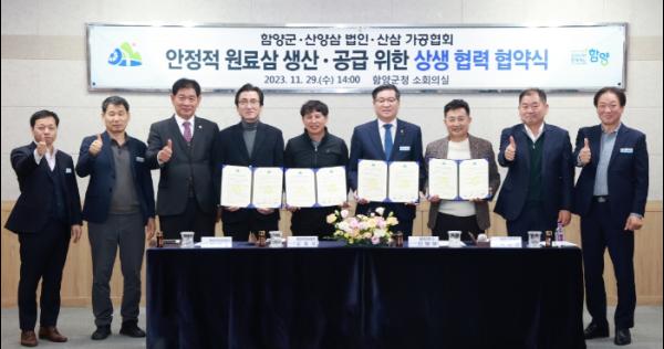 함양군은 11월 29일 오후 2시 군청 소회의실에서 지역 내 산양삼 생산 법인 및 가공협회와 ‘함양 산양삼 산업화와 안정적 원료삼 생산·공급을 위한 상생 협력 협약’을 체결했다.