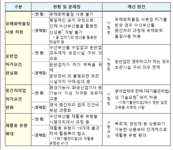 이 밖에도 ?화학물질관리법?상 유해화학물질 사용업 허가를 받은 경우에는 수산부산물 재활용 과정에 필요한 유해화학물질을 사용할 수 있도록 해주고, 수산부산물 운반업만 하는 업체는 보관시설 구비의무를 면제하는 등 현장 건의사항을 적극 반영하여 규제 개선의 체감도를 더욱 높였다.