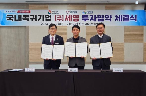 창원시는 경남도청 소회의실에서 경남도와 공동으로 ㈜세영과 국내복귀 투자협약(MOU)을 체결했다고 30일 밝혔다.