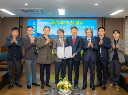 11월 30일 오전 영남대학교 본관 2층 총장실에서 진행된 협약식에는 문기봉 대구공공시설관리공단 이사장, 김상우 경영지원처장을 비롯해 최외출 영남대학교 총장, 박승우 교육혁신부총장 등 양 기관 관계자가 참석했다.