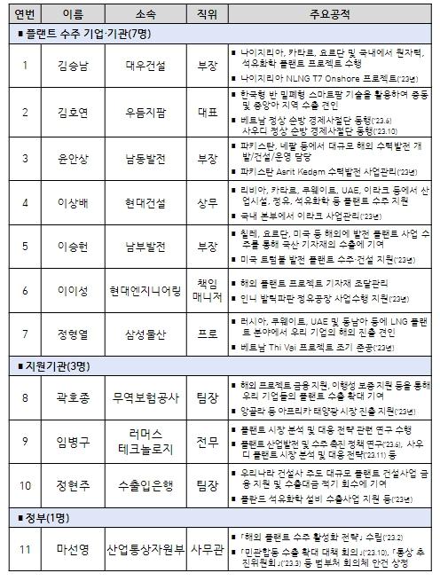 이날 행사에서는 해외 플랜트 수주 부문 유공자에 대한 산업부 장관 표창 시상식이 함께 진행됐다. 포상은 해외 플랜트 수주 일선에서 근무하는 플랜트 관련 기업·기관 담당자 7명, 우리 기업의 수주를 지원하는 지원기관 담당자 3명, 해외 플랜트 수주 관련 정책을 수립하는 정부 담당자 1명 등 3개 부문 11명이 수상했다.