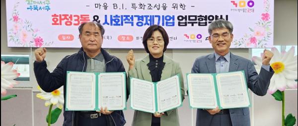 김진수 화정3동장은 “화정3동 마을 BI 특화조성에 사회적가치를 추구하는 기업과 협력하게 되어 매우 의미깊게 생각하며, 이번 협약이 마을발전 동력 마련과 사회적경제기업의 자생력 강화의 소중한 밑거름이 되기를 바란다”고 말했다.