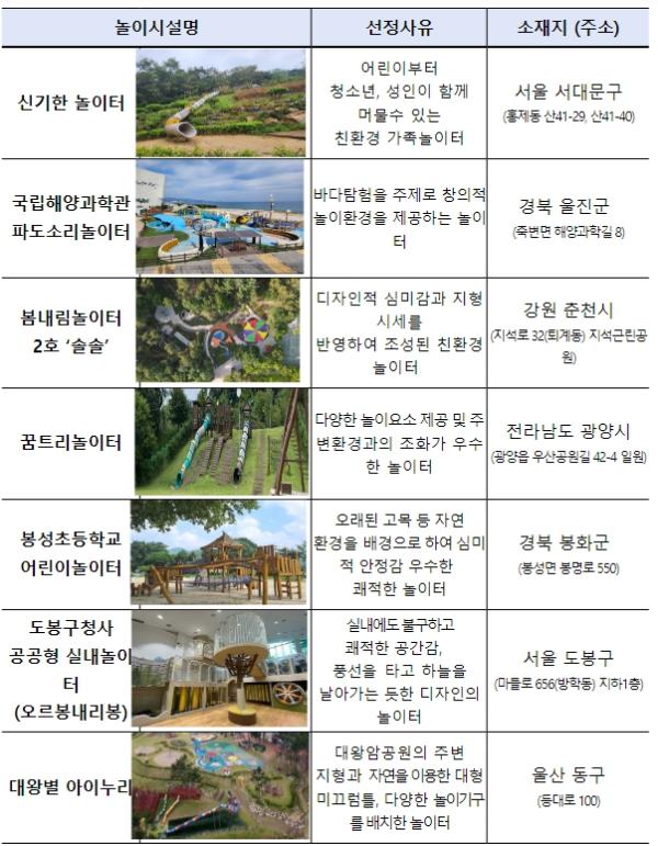 이번에 선정된 우수 어린이놀이시설은 다음과 같다.
