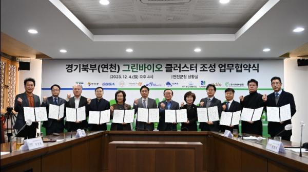 오후석 경기도 행정2부지사는 4일 연천군청에서 김덕현 연천군수, 제진수 경기도경제과학진흥원 미래성장부문 상임이사, 임환 한국과학기술연구원(KIST) 기술사업전략본부장, 정영식 동국대학교 연구부총장, 김영덕 ㈜CTC바이오 사장, 함정엽 ㈜네오켄바이오 대표, 박명애 ㈜한국지네틱바이오팜 대표, 전대영 ㈜우리기술 부사장, 최승우 ㈜티앤엘 부사장, 김종래 ㈜한미양행 전무이사와 이런 내용을 담은 ‘경기북부(연천) 그린바이오 클러스터 조성 업무협약’을 체결했다.