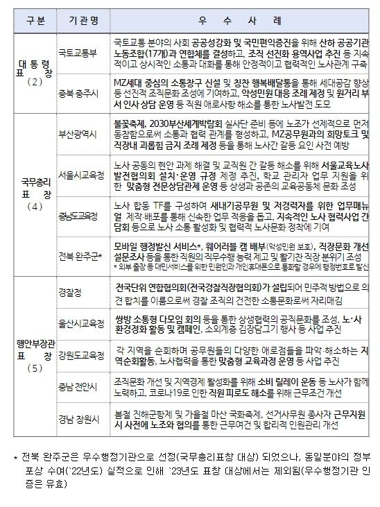 한편, 공무원 노사문화 우수행정기관 선정과 포상은 공직사회에 상생?협력의 노사문화를 확산시키기 위해 공무원노조, 공무원직장협의회 등 공무원단체와 기관의 우수사례를 인증하고 포상하는 제도로서 2010년부터 운영되고 있으며 2023년까지 138개 기관이 우수기관으로 선정됐다.
