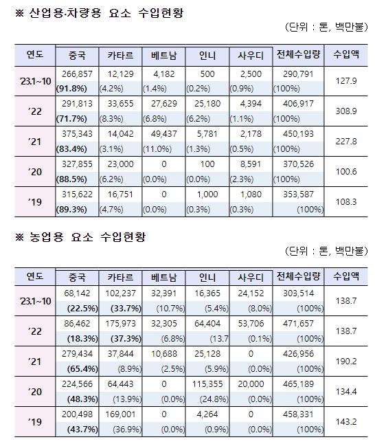 차량용 요소의 경우 일부 국내기업이 최근 베트남 등으로부터 요소 5천톤을 수입하기로 계약한 사실이 확인되어 당초 3개월분에서 현재 약 3.7개월분 물량으로 증가됐다. 정부와 업계는 앞으로도 중국 외의 지역에서 요소 물량을 추가 확보하는 노력을 지속 추진할 계획이다.
