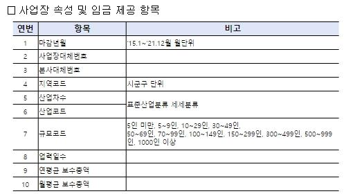 이번에 개방하는 데이터는 “사업장별 고용보험 피보험자 현황”으로 사업장별 고용보험 피보험자 수를 지역·산업·규모 등 사업장 특성과 함께, 성·연령·학력 등 피보험자 특성별로 제공하며, 동일 사업장을 패널로 구축한 자료로서 연구자 등이 시간에 따른 노동시장 내의 동적 변화를 포착하고 그로 인한 영향을 파악하기에 유용한 자료이다.