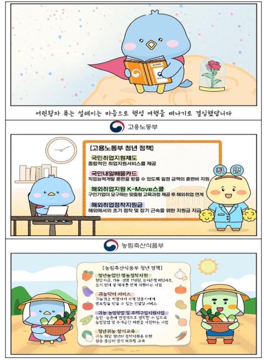 의견수렴을 통한 개선활동에 이어 이번에는 애니메이션 형식의 동영상을 제작하여 청년정책 홍보에 나선다. 영상에는 고용노동부(국민취업지원제도, 국민내일배움카드), 국방부(장병내일적금, 자기개발비용지원), 문화체육관광부(문화누리카드, 예술인창작준비지원금) 등 정부부처 및 산하기관에서 시행하는 일자리·주거·교육·문화복지·참여권리 정책이 알기 쉽게 담겨있다.