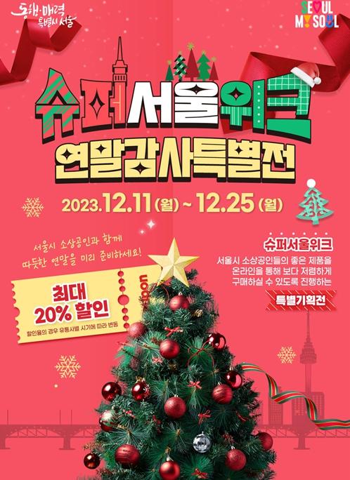 서울시는 12월 11일 ~ 25일까지 ?11번가 ?우체국쇼핑 ?G마켓 ?옥션 ?롯데온 5곳의 온라인쇼핑플랫폼에서 소상공인 제품을 저렴하게 판매하는'슈퍼서울위크 - 연말감사특별전'을 개최한다고 밝혔다.
