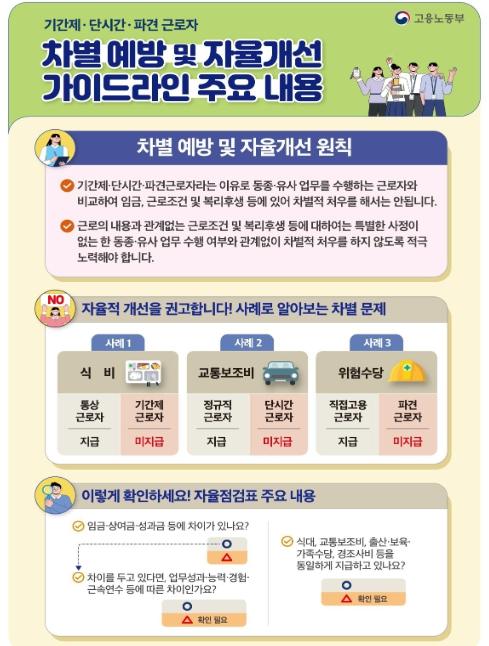 가이드라인은 사용자가 차별 문제를 스스로 점검, 자율적으로 개선할 수 있도록 사용자가 기본적으로 준수하거나 노력해야 할 사항을 안내하고 있다. 가이드라인에는 차별 예방을 위한 기본원칙, 구체적인 사례를 통한 권고 사항과 사업장 자율점검표 등이 포함되어 있다. 특히, 공정과 상식에 기반한 노동시장 약자 보호를 위해 ‘근로의 내용과 관계없는 복리후생적 처우는 특별한 사정이 없으면 동종·유사 업무 수행 여부와 관계없이 차별하지 않을 것’을 적극적으로 권고하고 있다.